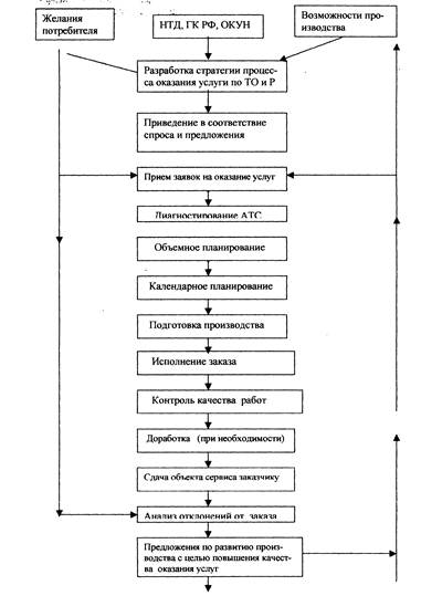 Проектирование процесса оказания услуг начинается с анализа спроса на услуги, которые сервисное предприятие может предложить своим потребителям, то есть с маркетинговых исследований. Известно [3], что маркетинговый комплекс услуг включает себя: - саму услугу, - цену услуги, - качество и срок оказания услуги, - расположение места предоставления услуги, - участие клиента в процессе оказания услуги, - физическое окружение, - сам процесс оказания услуги. Реализация маркетингового комплекса в сфере сервиса транспортных средств (СТС) базируется на изучении желаний потребителей, выборе и обосновании коммерческой идеи в виде предлагаемой услуги и анализе собственных возможностей по ее оказанию. Структурная схема проектирования процесса оказания услуг по техническому обслуживанию (ТО) и текущему ремонту (ТР) АТС представлена на рис. 1.2. Принципиально важным различием в проектировании процессов создания изделий и оказания услуг является то, что при проектировании конкретный потребитель их неизвестен, а услуги оказываются конкретному потребителю. Более того, согласно «Правилам оказания услуг по техническому обслуживанию и ремонту автомототранспортных средств», утвержденным правительством Российской Федерации 11 апреля 2001 г. за № 290, потребитель автосервиса может знать непосредственного исполнителя услуг, наблюдать за процессом оказания услуг и даже сам участвовать в нем. Общим в процессах проектирования товаров (АТС) и услуг (ТО, ТР, перевозка пассажиров и грузов, хранение АТС и т.п.) является, во-первых, проектирование их в соответствии с требованиями НТД (ГОСТов, ОСТов, ЕСКД, ЕСТД и т.д.) и, во-вторых, проектирование предприятий для изготовления (автозаводов) и эксплуатации АТС (автотранспортных, автосервисных и авторемонтных предприятий, паркингов, мотелей и т.д.)