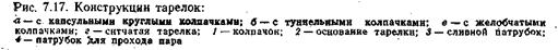 Тарельчатые колонны. Тарельчатым колоннам, составляющим основную группу аппаратов с поверхностью контакта, образуемой в процессе движения потоков, свойственны общие закономерности в структуре потоков на тарелках. В свою очередь от гидродинамической структуры потоков определяющих перемешивание на тарелках, зависит эффективность тарельчатых колонн. Тарельчатые колонны выполняют в виде вертикальных цилиндров, внутри которых одна под другой размещено определенное число горизонтальных перегородок-тарелок, обеспечивающих возможность встречного течения и контакта жидкости и пара (газа). Такого типа колонны имеют диаметр 0,5–8 м и высоту от 6 до 180 м в зависимости от вида разделяемых продуктов, производительности и т. д. В колоннах устанавливают следующие типы тарелок: провальные, колпачковые, сетчатые, клапанные, струйные и т. д. Некоторые конструкции тарелок показаны на рис. 7.17. В колпачковой тарелке (рис. 7.16,а) пар (газ) проходит снизу через паровые патрубки и выходит через прорези колпачков 3 в жидкость, барботируя через нее. При этом на тарелке конденсируется пар -и, одновременно испаряется жидкость.