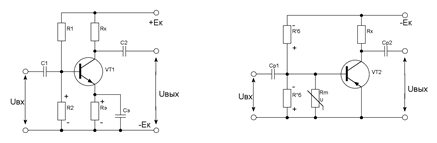 а б Рис. 17. Схемы со стабилизацией рабочей точки с делителем напряжения (а) и терморезистором (б)