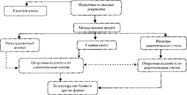 Мемориально-ордерная форма учета Сущность форм бухгалтерского учета Бухгалтерский учет ведется в многочисленных регистрах. Для учетной регистрации используются в разных сочетаниях книги, карточки, журналы-ордера, ведомости и отдельные листы, записи в которых могут производится в различной последовательности. Все это приводит к образованию разнородных форм бухгалтерского учета. 16-198 Под формой бухгалтерского учета понимается совокупность учетных регистров, предопределяющих связь синтетического и аналитического учета, методику и технику регистрации хозяйственных операций, технологию и организацию учетного процесса. Признаками, отличающими одну форму бухгалтерского учета от другой, являются: • количество применяемых регистров, их назначение, содержание, внешний вид; • взаимосвязь хронологических и систематических регистров синтетического и аналитического учета; • последовательность и способы записей в учетные регистры; • степень использования средств механизации и автоматизации в бухгалтерском учете. В настоящее время в организациях наиболее распространены мемориально-ордерная, журнально-ордерная и автоматизированная формы учета. Состав учетных регистров и последовательность записи в них при мемориаль- но-ордерной форме учета: При мемориально-ордерной форме учета по данным первичных или накопительных документов составляют мемориальные ордера, которые записываются в регистрационный журнал и затем в Главную книгу (регистр синтетического учета). Аналитический учет ведется в карточках, записи в которые делают на основании первичных или сводных документов. По данным синтетических и аналитических счетов по окончании месяца составляют оборотные ведомости, которые сверяются между собой. Мемориально-ордерная форма учета отличается строгой последовательностью учетного процесса, простотой и доступностью учетной техники, при ней широко используются стандартные формы аналитических регистров, счетные машины, копировальный способ регистрации. Кроме того, при ней легко осуществлять разделение учетной работы между квалифицированными и менее квалифицированными работниками. Схема 14