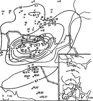 Традиционная Электрометал- технология лургия i-11-20-ЗВ-4 Рис. 15. Типы структур сфер воздействия традиционных металлургических производств и электрометаллургии: 1 — источник выбросов; 2 — зона геоматического воздействия; 3 — зона биотического воздействия; 4 — зона геохимического воздействия Зона геохимического воздействия металлургических производств может составлять несколько тысяч квадратных километров; интенсивные поступления выбросов вызывают превышение фоновых концентраций в компонентах и элементах ландшафтов (воздухе, воде, снеге, почве, торфе и т.д.). Зона биотического воздействия выделяется при фиксировании изменений в биотических элементах ландшафтов, вызванных геохимическим воздействием, это прежде всего уменьшение видового разнообразия в ярусах растительности, почвенной фауне и т.д. Так как нарушение или выпадение элементов биоты связано с накоплением ингредиентов выбросов в почвах, то проводят диагностирование состояния почв, в первую очередь изменение их химического состава. Внутри зоны по нарушенности элементов биоты возможны выделения подзон, например подзоны поражения эпифитной растительности, мхов и лишайников, подзоны угнетения древостоев и т.д. Зона геоматического воздействия (интенсивного поступления выбросов в течение длительного времени и вследствие этого структурной перестройки ландшафтов). Геохимические воздействия и нарушения биоты ландшафтов вызывают изменение их литогенной основы (гео- мы), т.е. практически происходит их трансформация и формирование «техногеом», в которых полностью отсутствуют биотические компоненты. Поступление выбросов в сферу воздействия проследим на примере Череповецкого металлургического комбината. Сфера воздействия Череповецкого комбината представляет собой эллипс, вытянутый с юго-запада на северо-восток, максимальное осаждение пыли — 30 мг/м3 в год, превосходящее фоновое значение в 3—4 порядка, наблюдалось непосредственно на территории завода, здесь осаждается 25—30% выбросов пыли, 50% осаждается в радиусе 7 км. К северо-западу от завода пост ление пыли уменьшается в 2 раза через 0,5 км, а к северо-востоку черв 1 км, достигая на расстоянии 50—55 км фоновых значений (рис. 16). Временной анализ сферы воздействия таков: после начала эксплуа| тации завода (мощность 1—1,5 млн т чугуна в год) средний ради> воздействия в течение пяти лет не превышал 10 км. Увеличение пр<з изводства до 3 млн т в год расширило сферу воздействия до 20—25 ю» дальнейшее наращивание мощностей до 5,5 млн т в год увеличил радиус воздействия до 40-45 км.