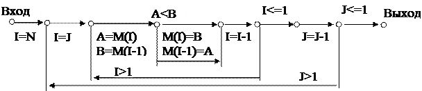 Сортировка методом всплывающего пузырька Процесс упорядочения данных в порядке их возрастания или убывания путем их перемещения в памяти или в файле называется сортировкой. Сравнивать можно численные данные, даты и даже строковые данные[11]. Наиболее простым алгоритмом сортировки является алгоритм "всплывающего пузырька" (рис. 4.33). Данные размещены в массиве М, состоящем из N элементов, переменные I и J – текущие индексы сравниваемых элементов массива, А и В – промежуточные переменные для временного хранения значений элементов массива. Два значения данных, стоящие последними в списке сравниваются между собой. Если последнее значение меньше предшествующего, то значения меняются местами. Аналогичная процедура выполняется для последующих пар значений. В результате наименьшее значение перемещается в начало списка подобно всплывающему пузырьку.