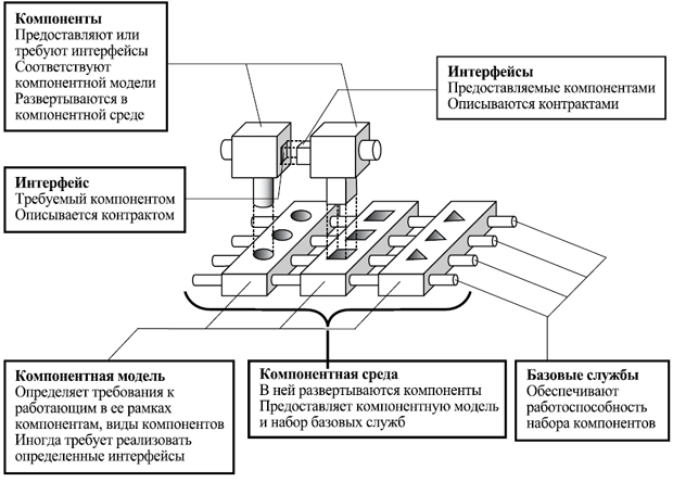 Существуют несколько компонентных моделей. Правильно взаимодействовать друг с другом могут только компоненты, построенные в рамках одной модели, поскольку компонентная модель определяет "язык", на котором компоненты могут общаться друг с другом. Помимо компонентной модели, для работы компонентов необходим некоторый набор базовых служб (basic services). Например, компоненты должны уметь находить друг друга в среде, которая, возможно, распределена на несколько машин. Компоненты должны уметь передавать друг другу данные, опять же, может быть, при помощи сетевых взаимодействий, но реализации отдельных компонентов сами по себе не должны зависеть от вида используемой связи и от расположения их партнеров по взаимодействию. Набор таких базовых, необходимых для функционирования большинства компонентов служб, вместе с поддерживаемой с их помощью компонентной моделью называется компонентной средой (или компонентным каркасом, component framework). Примеры известных компонентных сред — различные реализации J2EE,.NET, CORBA. Сами по себе J2EE,.NET и CORBA являются спецификациями компонентных моделей и набора базовых служб, которые должны поддерживаться их реализациями. Компоненты, которые работают в компонентных средах, по-разному реализующих одну и ту же компонентную модель и одни и те же спецификации базовых служб, должны быть в состоянии свободно взаимодействовать. На практике этого, к сожалению, не всегда удается достичь, но любое препятствие к такому взаимодействию рассматривается как серьезная, подлежащая скорейшему разрешению проблема. Соотношение между компонентами, их интерфейсами, компонентной моделью и компонентной средой можно изобразить так, как это сделано на рис. 12.1.