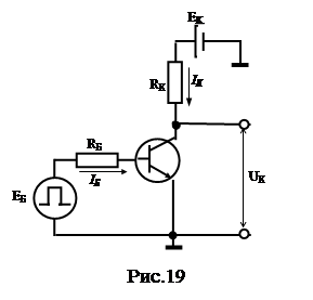 Ключевой режим работы характеризунтся большой амплитудой переключающего импульса, когда транзистор переходит из состояния с большим внутренним сопротивлением (ключ разомкнут) в состояние с малым сопротивлением (ключ замкнут) и обратно.. Схема простейшего ключа на n-p-n-транзисторе приведена на рис.19. На рис.20 а показаны выходные статические характеристики, нагрузочная характеристика и расположение рабочих точек A и B. На рис.20 б показано расположение рабочих точек A и B на входных харвктеристиках.