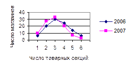 Полигон распределения магазинов района по числу товарных секций отражает процесс уменьшения товарных секций