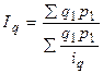 Пусть соизмеритель – это цены текущего периода p1 и известны индивидуальные индексы физического объема iq и фактическая стоимость товаров в текущем периоде (q1p1). Тогда общий индекс физического объема определяется по формуле средней гармонической: