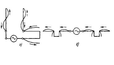 Все антенны, использующие этот принцип работы, относятся к классу несимметричных антенн. К ним также принадлежат Г-образные и Т-образные антенны (рис. 1.2, б и в ). Фидер излучает, если соседние участки его двух проводов обтекаются токами, совпадающими по фазе, поля которых усиливают друг друга. Для этого необходимо создать фазовый сдвиг в половину длины волны, например, за счет неизлучающего шлейфа (рис. 1.3, а). На таком же принципе основаны синфазные антенны, получившие широкое распространение (рис. 1.3, б).