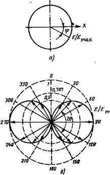 Входное сопротивление антенны — сопротивление на входных зажимах антенны. Оно имеет реактивную и активную составляющие. При настройке в резонанс антенна представляет для генератора чисто активную нагрузку и используется наиболее эффективно. Направленность антенны — способность излучать электромагнитные волны в определенных направлениях. Об этом свойстве антенны судят по диаграмме направленности, которая графически показывает зависимость напряженности поля или излучаемой мощности от направления. Практически пользуются нормированными диаграммами направленности, где величины, характеризующие напряженность поля или мощность излучения, выражены не в абсолютных значениях, а отнесены к максимальному значению. В целях упрощения обычно используют не пространственную диаграмму направленности, а ограничиваются диаграммами направленности в двух плоскостях: горизонтальной и вертикальной. На рис. 1.4, а показана диаграмма направленности симметричного вертикального вибратора в горизонтальной плоскости,