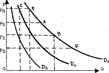 Например, по определённой цене P1 покупатель Петров покупает товар X в количестве Q0 единиц (точка А). Вдруг у Петрова появляется дополнительный источник дохода. При повышении дохода Петров теперь может приобрести по цене P1 большее количество товара (Q1). Следовательно, по ценам P1 и Р2 Петров будет покупать больше товара, и кривая спроса перемещается вправо. Если происходит снижение Q, то кривая сместится влево (D2) означает, что при соответствующих ценах сократится объём продаж.