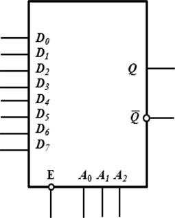 Рис.40. Условное изображение восьмиразрядного мультиплексора Схема имеет 8 информационных входов D 0 – D 7 (на них подаются входные логические сигналы), 3 адресных входа A 0, A 1, A 2, управляющий вход Е – разрешение. Прямой выход Q и инверсный выход