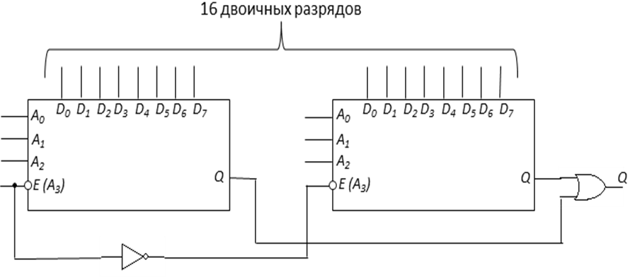 Рис.41. Схема шестнадцатиразрядного мультиплексора, построенного на основе двух восьмиразрядных мультиплексоров