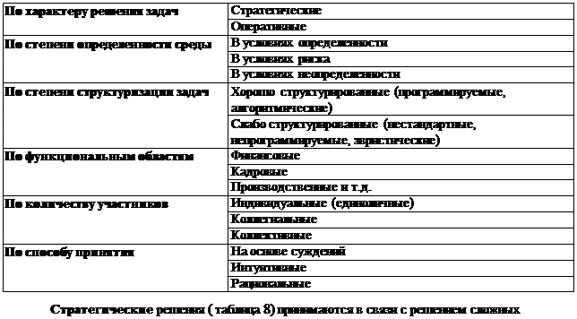 3.1. Понятие и типология решений, факторы неопределенности в процессе принятия решений Деятельность человека основана на принятии решений. Любому человеку постоянно приходится принимать решения по поводу того, что купить, что поесть, какую работу выбрать, куда поехать, и всегда это выбор среди множества альтернатив. Управленческое решение отличается сознательностью и особой ответственностью, т.к. носит общественный характер, затрагивая интересы многих групп людей, поэтому требует особо взвешенного научного подхода. Менеджер обладает властью, полномочиями принимать решения, он же несет ответственность за его выполнение, за использование ресурсов, за судьбы людей. Принятие управленческого решения — это выбор наилучшего способа достижения какой-либо цели управления в процессе анализа вариантов. Таблица 8