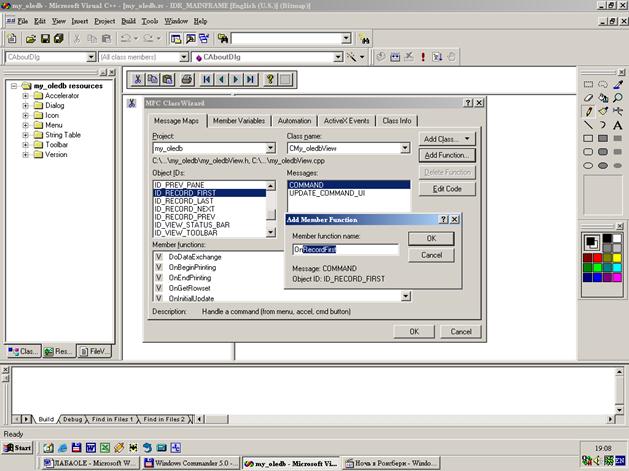 Теперь перейдём к описанию модулей для работы с курсором источника данных. Для этого необходимо переопределить стандартные методы, используемые элементами навигации, расположенными в элементе управления Toolbar. Таким образом, загружаем ClassWizard, переходим на закладку Message Maps, отыскиваем группу идентификаторов, отвечающих за навигацию по записям источника данных(ID_RECORD_FIRST, ID_RECORD_LAST, ID_RECORD_NEXT, ID_RECORD_PREV), и создаём обработчики. Рассмотрим подробно создание обработчика для идентификатора ID_RECORD_ FIRST. Для этого после выбора мышью в окне Object IDs идентификатора ID_RECORD_ FIRST в окне Messages выберем COMMAND. После этого нажмём кнопку “Add Functions”. В результате этого появится диалог с предложением создать метод с именем OnRecordFirst (рис. 1.8).