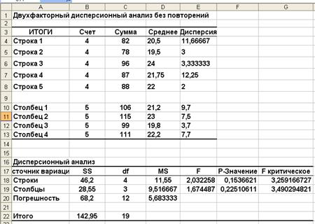 Рассмотрим использование функции Двухфакторный дисперсионный анализ без повторений (Anova: Two-Factor Without Replication) на следующем примере.
