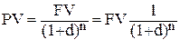 Настоящая (текущая, современная) стоимость денег представляет собой сумму будущих денежных поступлений, приведенных с учетом определенной ставки процента (так называемой дисконтной ставки) к настоящему периоду. Определение настоящей стоимости денег связано с процессом дисконтирования, который представляет собой операцию, обратную наращению при обусловленном конечном размере денежных средств. В этом случае сумма процента (дисконта – d) вычитается из конечной суммы (будущей стоимости) денежных средств. Такая операция возникает в тех случаях, когда нужно знать, сколько средств необходимо инвестировать сегодня, чтобы через определенный период времени при известном проценте годовых получить заранее обусловленную их сумму. Настоящая стоимость денег рассчитывается по следующей формуле: