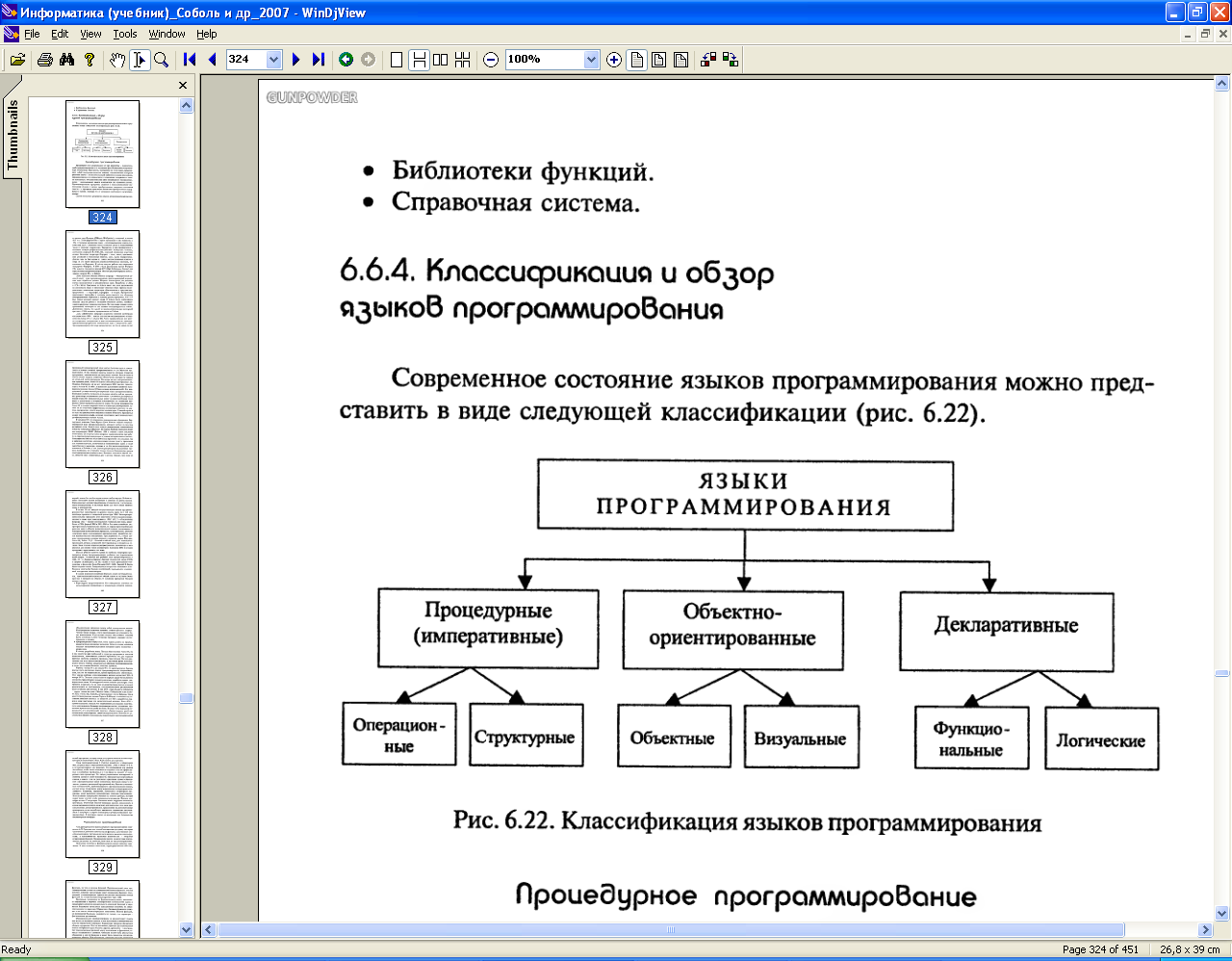 Классификация и обзор языков программирования Системы программирования Компиляторы и интерпретаторы Основу каждой системы программирования составляет транслятор. Это программа, переводящая текст на языке программирования в форму, пригодную для исполнения (на другой язык). Такой формой обычно являются машинные команды, которые могут непосредственно исполняться компьютером. Различают несколько видов трансляторов: компиляторы, интерпретаторы, конверторы. Компилятор, обрабатывая исходную программу, создает эквивалентную программу на машинном языке, которая называется также объектной программой, или объектным кодом. Интерпретатор, распознавая, как и компилятор, исходную программу, не формирует машинный код в явном виде. Для каждой операции, которая может потребоваться при исполнении исходной программы, в программе-интерпретаторе заранее заготовлена машинная команда или команды. «Узнав» очередную операцию в исходной программе, интерпретатор выполняет соответствующие команды, потом – следующие, и так всю программу. Интерпретатор – это переводчик и исполнитель исходной программы. Конвертор – транслятор, переводящий программу не в машинный код, а на другой язык программирования. Процесс создания программы включает: • Составление исходного кода программы на языке программирования. • Этап трансляции, необходимый для создания объектного кода программы. • Построение загрузочного модуля, готового к исполнению. Все перечисленные выше действия требуют наличия специальных программных средств. Совокупность этих программных средств входит в состав системы программирования: • Текстовый редактор (необходимый для создания и редактирования исходного кода программы на языке программирования). • Компилятор. • Редактор связей. • Отладчик. • Библиотеки функций. • Справочная система. Современное состояние языков программирования можно представить в виде следующей классификации (рис. 6.1).