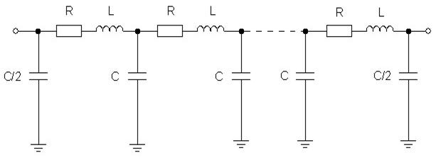 Назначение: Моделирует однофазную линию электропередачи с сосредоточенными параметрами. В реальной линии электропередачи сопротивления, индуктивность, и емкость равномерно распределены вдоль линии. Приближенная модель линии (рис. 2) может содержать от одной до нескольких идентичных секций с сосредоточенными параметрами. Число секций зависит от частотного диапазона, который необходимо охватить при моделировании. Приближенно число секций можно определить из выражения:
