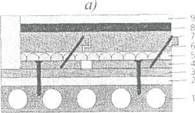 Підлога - це багатошарова конструкція, яка складається із ряду послідовно розташованих шарів, що укладають на міжповерхові перекриття, а на перших поверхах та в підвалах - по ґрунту. Загальні вимоги до підлог залежать від функціонального призначення і характеру приміщень. Підлоги повинні бути: > міцними і довговічними (добре чинити опір > жорсткими, нековзкими та безшумними при ходінні > гігієнічними (легко очищуватись від пилу та бруду); > естетичними (гармонійно поєднуватись з > зручними в експлуатації (не утворювати пилу, легко > економічними (мати мінімальні показники Спеціальні вимоги: > вологостійкість і водонепроникність (для санітарно- > високий ступінь вогнестійкості та підвищений опір ^ еластичність і безшумність (для приміщень лікувальних закладів); > стійкість до хімічно агресивних речовин (для вироб У конструкції підлоги залежно від її призначення та виду виділяють такі основні конструктивні елементи: покриття, підстильний шар, прошарок, стяжку, гідроізоляцію та основу. Покриття - це верхній шар, який безпосередньо зазнає експлуатаційних впливів. За видом матеріалу, з якого виготовлено покриття, дають назву підлозі: дощата, паркетна, плиточна тощо. Залежно від матеріалу покриття розрізняють підлоги: > безшовні з суцільним покриттям; > зі штучних матеріалів; > із рулонних матеріалів; > з листових матеріалів. Безшовні підлоги виготовляють з бетону та бетону з різними домішками, асфальтобетону, цементно-піщаного розчину, полімерів, ксилоліту тощо. Підлоги з покриттям із штучних матеріалів є більш трудомісткими. Для влаштування таких підлог використовують залізобетонні та металеві плити, керамічні та пластмасові плитки, цеглу, камінь тощо. Підстильний шар - елемент підлоги, який розподіляє навантаження на грунт. Його виготовляють з бетону, асфальтобетону, гравію, щебеню, піску та інших матеріалів. Товщину підстильного шару визначають на основі розрахунків залежно від навантажень і приймають із: > бетонів класів В22,5 і вище - не менше 100 мм; > піску - не менше 60 мм; > гравію та щебеню - не менше 80 мм. У бетонних підстильних шарах підлог, при експлуатації яких можливі перепади температур, роблять деформаційні шви. які розміщують у взаємно перпендикулярних напрямках через 8...12 м. Прошарок - це проміжний шар, який зв'язує покриття підлоги з нижчерозташованим шаром і виконує функції пружної постелі. Як прошарки використовують: > цементно-піщаний розчин товщиною 10... 15 мм: > рідке скло з ущільнюючою домішкою товщиною *• зв'язуюче па основі бітумних мастик товщиною 2...3 мм і синтетичних смол товминою 3...4 мм; > дрібнозернистий бетон класу не нижче ВЗО У підлогах з металевих та бетонних плит обладнують піщані прошарки товщиною 60... 150 мм. Прошарки можуть виконувати теплоізоляційні функції. В цьому випадку їх виготовляють з теплоізоляційних матеріалів товщиною 60...150 мм. Стяжка -це шар підлоги, який виконує такі функції: > вирівнювання поверхні нижчерозташованого шару; > розподіл навантажень по нежорстких шарах підлоги > забезпечення нормованого теплозасвоєння підлоги; > надання покриттю підлоги заданого ухилу; > укриття різних трубопроводів. Стяжки виконують: > для вирівнювання нижчерозташованого шару і > для створення ухилу на перекритті (з бетону В7,5 > під наливні полімерні покриття (з бетону класу не Легкий бетон у стяжках використовують 