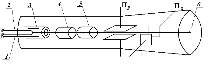 Рисунок 1 Схема электронно-лучевой трубки: Пx и Пy – горизонтально и вертикально отклоняющие пластины; 1 – катод; 2 – нить накала; 3 – диафрагма; 4, 5 – ускоряющие аноды; 6 – экран