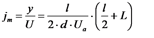 Для отклонения электронного луча используется система из двух пар металлических параллельных пластин, расположенных во взаимно перпендикулярных плоскостях. Электрическое поле пластин, расположенных горизонтально, отклоняет луч вертикально – это вертикально отклоняющие пластины Пy. Другая пара пластин, расположенных вертикально, носит название горизонтально отклоняющих пластин Пx. Для характеристики отклоняющей системы используют чувствительность трубки к напряжению на пластинах. Чувствительность трубки Рассмотрим движение электронного пучка. Допустим, что электрическое поле, созданное управляющими пластинами однородно и перпендикулярно к плоскости пластин (рисунок 2). Полное отклонение На основании законов кинематики и динамики движения заряженных частиц в электрическом поле можно получить формулы для расчета отклонения луча на экране: