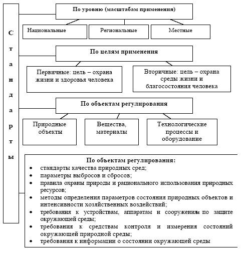 Рис. 1. Классификация стандартов в области экологи Санитарно-гигиенические нормативы - это качественно-количественные показатели, соблюдение которых гарантирует безопасные или оптимальные условия существования человека. Санитарно-эпидемиологические правила и нормы (далее - санитарные правила) - нормативные правовые акты, устанавливающие санитарно-эпидемиологические требования (в том числе критерии безопасности и (или) безвредности факторов среды обитания для человека), несоблюдение которых создает угрозу жизни или здоровью человека, а также угрозу возникновения и распространения заболеваний; В связи с высокой социальной значимостью охраны здоровья человека санитарно-гигиеническое нормирование в нашей стране было разработано и внедрено в практику управления природопользованием раньше других направлений нормирования. Методологическая база гигиенического нормирования в настоящее время является наиболее теоретически обоснованной, методически проработанной и организационно оформленной. К настоящему времени система государственного санитарно-эпидемиологического нормирования в РК достаточно четко оформлена и включает следующие основные направления (рис. 2).