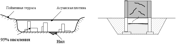 На ниже приведенном рисунке даны две схемы использования искусственных песчаных оснований. На первой схеме показан результат успешного использования Асуанской плотины в Египте на реке Нил, отсыпанной из песка с необходимой степенью плотности. Плотина перекрывает пойменную террасу реки Нил, в плодородной дельте которой практически проживают 95% населения Египта. Созданная конструкция плотины при плотной укладке песка позволяет ее надежно эксплуатировать на долгие годы. На второй схеме приведена типичная строительная ошибка, возникающая тогда, когда наружные несущие стены здания, имеют фундаменты более глубокого заложения, чем внутренние перегородки. В этом случае часто фундаменты под перегородки устраивают на песчаной подсыпке, без необходимой степени уплотнения. Такие основания, являясь структурно неустойчивыми, при незначительных динамических воздействиях дают значительную неравномерную осадку, создавая условия возникновения трещин в надземных конструкциях.