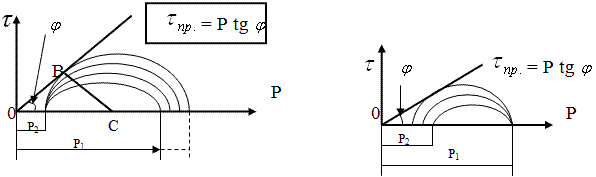 Соотношения между минимальным и максимальным значениями главных напряженийПоскольку предельное состояние (разрушение в грунте) возникает от действия касательных напряжений, то оно может произойти тогда, когда точка М (ее положение) коснется прямой Кулона, прямой предельного состояния грунта. В процессе испытаний оставляем неизменным Р2 и увеличиваем Р1. Максимальное значение Р1 будет, когда круг Мора коснется прямой Кулона. τпр=P tgφ - уравнение, описывающее предельное сопротивление грунта сдвигу для песчаного грунта, т.е. процесс разрушения. Описанная методика испытаний схематично представлена на нижерасположенном левом рисунке.