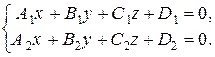 Напомним, что в аналитической геометрии любая пространственная линия рассматривается как пересечение двух поверхностей. Так как каждая прямая всегда может быть помещена в некоторую плоскость и при пересечении двух плоскостей образуется прямая, то в аналитической геометрии прямую в пространстве принято задавать как пересечение двух плоскостей. Итак, пусть