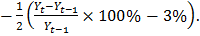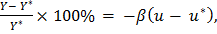 где u – фактический уровень безработицы; и* – естественный уровень безработицы; (и – и*) – уровень циклической безработицы; β – коэффициент Оукена(β > 1), показывающий, на сколько процентов сокращается фактический объём выпуска по сравнению с потенциальным, если фактический уровень безработицы увеличивается на 1 процентный пункт. Таким образом, коэффи-циент Оукена – это коэффициент чувствительностиотклонения ВВП к измене-нию уровня циклической безработицы. Для экономики США в те годы, по расчётам Оукена, он составлял 2,5. В других странах и в другие периоды времени он может быть численно иным. Знак "минус" перед выражением, стоящим в правой части уравнения, отражает обратную зависимость между фактическим ВВП и уровнем циклической безработицы: чем выше уровень безработицы, тем меньше величина фактического ВВП по сравнению с потенциальным. Отклонение фактического ВВП (Yt) любого года можно подсчитать также по отношению к фактическому ВВП предыдущего года (Yt-1) Формулу для такого расчёта также предложил А. Оукен: