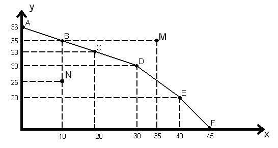 3. Проведём анализ данного графического изображения, опираясь на общеизвестные экономические положения: а) Кривая производственных возможностей (криваятрансформации) представляет собой выпуклую форму. В чём мы и убедились, строя данную линию. Кривизна объясняется действием закона возрастающих альтернативных издержек. В случае прямой линии это означало бы, что альтернативные издержки производства любого из двух продуктов постоянны, в какую бы точку на данной прямой линии ни перемещалась экономика. б) Минимальное количество продукта Y (газонокосилки), которым необходимо пожертвовать для увеличения производства продукта Х (масла) на единицу называется предельной нормой трансформации. Так, первые 10 т масла стоят 1 газонокосилки (36 – 35); – точка B. Вторые 10 т масла – уже 2 газонокосилки (35 – 33); – точка C. Третьи 10 т – 3 газонокосилки (33 – 30); – точка D. Четвёртые 10 т – 10 газонокосилок (30 – 20); – точка E. Последние пять тонн – 20 газонокосилок (20 – 0); - точка F. Таким образом, мы видим, что каждые последующие 10 т масла обходятся обществу всё дороже и дороже, а что же касается последних пяти тонн масла, то они самые дорогие. · Точки: B, C, D, E, принадлежащие данной КПВ, отражают предельные возможности совместного производства обоих продуктов. · Точки A и F характеризуют ситуацию, при которой производится только один из продуктов при условии полного отказа от производства другого продукта. в) Постепенное удорожание производства масла объясняется тем, что при увеличении его выпуска приходится использовать ресурсы, приспособленные для производства газонокосилок. Поскольку производительность ресурсов в разных процессах производства различна, то переключение их из одной сферы применения в другую приводит к росту альтернативных издержек производства. Тем самым, согласно закону возрастающих альтернативных издержек, по мере увеличения выпуска данного продукта (масла) для получения каждой следующей, т.е. дополнительной его единицы приходится отказываться от другого продукта (газонокосилок) во всё большем количестве. Следовательно, издержки производства данного продукта (масла) можно выразить в издержках другого продукта (газонокосилок), от производства которого приходится отказываться. В экономике такая стоимость или такие издержки производства называются альтернативными (вмененными) издержками. Продукт, выраженный в другом продукте, которым пришлось пожертвовать при экономическом выборе, называется альтернативным продуктом. Значит, альтернативные (вмененные) издержки – издержки одного продукта, выраженные в другом продукте, которым пришлось пожертвовать для получения первого. г) Функционирование экономики на границе своих производственных возможностей отражает Парето-эффективное размещение ресурсов, т.е. такое размещение ресурсов, при котором нельзя увеличить выпуск одного продукта, не сократив выпуск другого. Так, двигаясь по кривой производственных возможностей, действительно, мы видим, что с увеличением производства масла выпуск газонокосилок сокращается, и наоборот. 4. Кривая производственных возможностей подвижна: а) Она может сместиться влево или вниз. Об этом свидетельствует предлагаемый в условии задачи выбор сочетания продуктов, соответствующий координатам точки N (10; 25). Однако данный выбор неудачный (неэффективный), т.