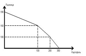 Б) Если исходить из того, что на этот год фермеру потребовалось произвести только 200 т пшеницы, то ему выгоднее всего ее посадить на том поле, где потери в виде недополученного картофеля будут минимальными, т.е. там, где альтернативная стоимость пшеницы наименьшая. В силу того что на нижнем поле альтернативная стоимость 1 т П. = 2,5 т К., а на верхнем 1 т П. = 3 т К., то фермеру выгоднее произвести 200 тонн пшеницы на том поле, где каждая тонна пшеницы предполагает отказ от производства 2,5 тонн картофеля, т.е. на нижнем. При производстве только 200 т пшеницы потери в виде недополученного картофеля составят 500 тонн (2500 т К. – 200 т П. ×2,5). Отсюда максимально возможное производство картофеля будет 2000 тонн.