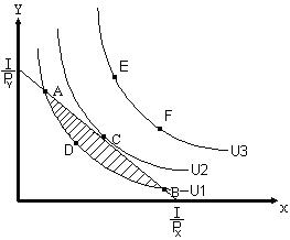Дано: 1. Три кривых безразличия U1–U3. 2. Бюджетное ограничение Рх × Х + Py × Y = I, где I – номинальный доход (величина постоянная). 3. Наборы продуктов, соответствующие точкам A, B, C, D, E и F. Доказать: что набор продуктов, соответствующий точке C (рис. 2.9.), отражает ситуацию потребительского равновесия, в которой рациональный потребитель достигает максимум общей полезности.