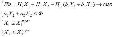 Для определения оптимальной производственной программы по критерию максимизации прибыли необходимо математически формализовать поставленную задачу, а именно записать целевую функцию и ограничения. Учитывая введенные ранее обозначения, математическая постановка задачи поиска оптимального объема производства по критерию максимизации прибыли для одного периода примет следующий вид: