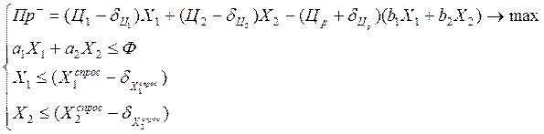 При расчете оптимальной производственной программы, необходимо оценить наихудшие и наилучшие результаты, то есть определить оптимальный объем производства и прибыль для пессимистического и оптимистического прогноза изменения параметров задачи, которые были получены в первой главе. Оптимистический и пессимистический варианты также необходимо просчитать на пять будущих периодов. Математическая модель расчета оптимальной производственной программы для пессимистического варианта имеет вид: