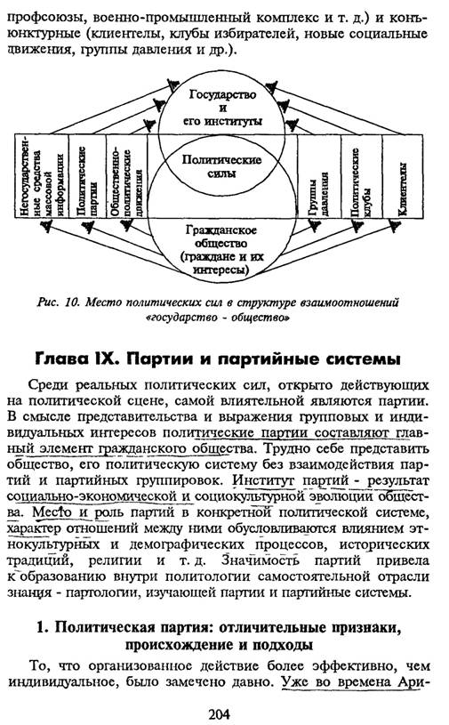 арастающее многообразие интересов, ориентации, установок и ценностей, лежащих в основе взаимодействия индивидов и групп, является показателем жизнеспособности и прогресса общества. Усложнение потребностей и интересов людей обусловливает рост разнообразия их деятельности, отношений, социальных групп, образов жизни, индивидуальностей. Между тем возможности отдельно взятого человека представлять и выражать свой индивидуальный интерес в структурах власти ограничены. Общество, благодаря своей способности разделять функции, специализировать и интегрировать людей, обеспечивает целенаправленность и поступательность собственного развития. Для представительства, выражения и согласования разнородных интересов оно создает специальные институты и механизмы. Так, для выражения «общего интереса» было создано государство. Однако «общий интерес», долго скрывавший тайну государства, вовсе не был однородным, а являлся обобщением частных интересов. Индивиды с одинаковыми интересами и ориентациями объединялись для того, чтобы придать им законный характер, представить их в системе власти, защитить от притеснения со стороны других групп. Для отстаивания частных интересов и потребностей в гражданском обществе создаются политические силы. Под политической силой понимается совокупность доктрин, идей, групп, партий и движений, осуществляющих влияние на власть или принимающих участие в ее реализации. Они выступают связующим звеном между государством и гражданским обществом, принадлежа теми или иными аспектами деятельности к обеим сферам. Различают реальные и латентные (скрытые)политические силы. Реальные политические силы борются за власть и открыто действуют на политической сцене. Главные среди них -политические партии. Латентные политические силы складываются из отдельных граждан или социальных групп и могут при определенных обстоятельствах трансформироваться в активные политические силы. Латентные силы бывают двух типов - структурные (к ним относятся классы, этносы, элиты,