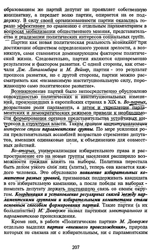 механизмами. Эти партии стали преемниками тех организаций и институтов, которые существовали ранее и действовали на политической сцене, однако не участвовали в выборах. Так, профсоюзы и Фабианское общество составили основу лейбористской партии в Великобритании; философские общества способствовали созданию либеральных партий в Европе; религиозные движения и группы переросли в христианско-демократические партии; из крестьянских профсоюзных групп произошли современные аграрные партии в странах Центральной и Северной Европы; промышленные и финансовые группировки содействовали созданию широкого спектра правых партий; из революционных групп, действовавших в нелегальных условиях, формировались коммунистические партии; союзы бывших фронтовиков становились основой фашистских партий в Италии и Германии; из клиентел выходили мощные партии «избирателей» (например, из клиентелы Шарля де Голля сформировалась одна из влиятельных партий Франции - Объединение в поддержку Республики). Партии электорального и парламентского происхождения, как правило, менее централизованы, аморфны в организационном плане. В них большую роль играют парламентарии, входящие в руководство партии. Они являются главными действующими лицами и практически определяют стратегию партии. Партии «внешнего происхождения», при всем различии их политических целей, характеризуются большей централизованностью, высокой групповой сплоченностью, строгой партийной дисциплиной, стремлением подчинить парламентскую фракцию руководящим органам партии, недоверием к парламентской деятельности. Потребности эффективного представительства интересов гражданского общества в структурах власти постоянно изменяли подходы к определению природы партии. В начале XDC в., в период бурных идейных дискуссий, предназначение партии виделось в том, чтобы она выступала носителем идеала, была выразителем доктрины заинтересованных групп. Партия была призвана выражать общность убеждений, идеалов и норм. Б. Констант так сформировал либеральное понимание партии:«Партия - это объединение людей, исповедующих одну и ту же политическую доктрину». Промышленная революция, углубив дифференциацию социальных интересов, существенно обострила классовые антагонизмы. Имущие и неимущие классы для защиты и выражения своих интересов стали создавать собственные партии. Мар- ксизм,рассматривая политическую партию с позиций классового подхода, определяет ее как высшую форму организации класса. Однако если в XIX в. определить социальную базу партий, основываясь на классовом подходе, было достаточно просто, то в настоящее время сделать это практически невозможно. Появление новых видов потребностей (как материальных, так и нематериальных) в постиндустриальных обществах порождало возрастающее разнообразие деятельности людей и усложняло социальную структуру. Процессы дифференциации и интеграции в сфере производства стимулировали активные социальные перемещения, делали границы между социальными группами в известной мере условными. Усложнение социальной структуры влияло на содержание идеологических предпочтений, которые стали значительно более подвижны и плюралистичны. Подобные социальные сдвиги не позволяли объяснить природу партий в рамках либерального и марксистского подходов. 