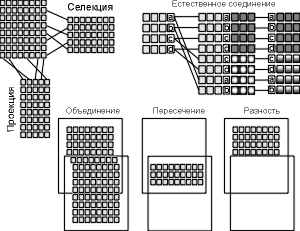 Рис. 3.3. Некоторые операции реляционной алгебры Созданы языки манипулирования данными, позволяющие реализовать все операции реляционной алгебры и практически любые их сочетания. Среди них наиболее распространены SQL (Structured Query Language – структуризованный язык запросов) и QBE (Quere-By-Example – запросы по образцу) [3, 5]. Оба относятся к языкам очень высокого уровня, с помощью которых пользователь указывает, какие данные необходимо получить, не уточняя процедуру их получения. С помощью единственного запроса на любом из этих языков можно соединить несколько таблиц во временную таблицу и вырезать из нее требуемые строки и столбцы (селекция и проекция).