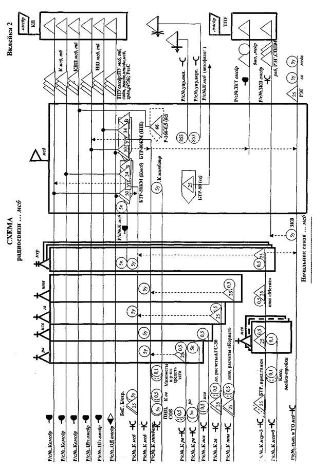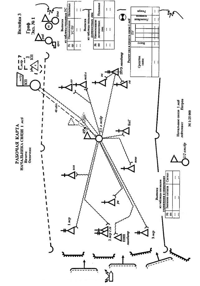 Документы по связи, разрабатываемые в мсб (тб) На основе принятого и утвержденного у начальника штаба мсб (тб) решения начальник связи батальона разрабатывает документы по связи: - рабочую карту начальника связи мсб (тб); - схему радиосвязи мсб (тб). Рабочая карта начальника связи батальона ведется на карте такой же номенклатуры, что и решение командира батальона на бой. Как правило, в батальоне применяются карты масштаба 1:25 000. На рабочей карте начальника связи батальона отражаются (вклейка 3): - передний край обороны или задачи батальона в наступлении; - разграничительные линии батальона; - места развертывания узлов связи пунктов управления вышестоящего штаба, своего батальона, подчиненных и взаимодействующих подразделений (частей), запасные места их развертывания и направления перемещения в ходе наступления; - элементы системы связи вышестоящего штаба и единой сети электросвязи (ЕСЭ) в районе выполнения батальоном боевой задачи; - район расположения резерва сил и средств связи (РезС) батальона, направление его перемещения в ходе наступления; - планируемые трассы полевых кабельных линий, которые должны соответствовать направлениям их реальной прокладки на местности; - планируемые линии радиорелейной связи (при развертывании на КНП батальона радиорелейной аппаратной ННС бригады) с указанием азимутов на корреспондентов и канальной емкости (групповой скорости) радиорелейных линий; - расчет сил и средств связи батальона (таблица); - выписка из таблицы позывных узлов связи (таблица); - выписка из таблицы сигналов управления и оповещения; - выписка из таблицы позывных должностных лиц; - органы технического обеспечения связи (ТОС) и АСУ, СППМ бригады; - районы развертывания средств РЭБ противника, возможные зоны их воздействия. Рабочая карта подписывается начальником связи батальона. На ней указываются даты начала и окончания ее ведения. К установленному времени готовности связи реальное состояние связи в батальоне должно соответствовать отраженной на рабочей карте организации связи (к началу боевых действий). В дальнейшем рабочая карта ведется в реальном масштабе времени, т.е. на ней отражаются все изменения по связи. На схеме радиосвязи отражаются (вклейка 2): - номера, наименования и состав радиосетей; - тип каналообразующей аппаратуры; - вид связи; - пункты управления, на которых развертываются радиосредства; - принадлежность средств связи. Схема радиосвязи подписывается начальником связи батальона, отрабатывается заранее и уточняется в ходе планирования связи. Кроме перечисленных документов начальник связи разрабатывает: - схему-приказ УС КНП батальона (вариант схемы-приказа УС КНП тб представлен на вклейке 4); - схему-приказ МБУ (прил. 4); - схему-приказ телефонной станции (прил. 5); - схему вызова (прил. 6). К установленному распоряжением по связи штаба бригады времени начальник связи батальона представляет начальнику связи бригады донесение по связи, которое доводиться, как правило, устным докладом. В донесении по связи отражается следующее: - место развертывания узла связи КНП мсб (тб); - анализ работы системы связи батальона за сутки; - принятые меры по повышению устойчивости работы системы связи; - нарушения безопасности связи; - анализ воздействия средств РЭБ противника на систему связи батальона; - потери сил и средств связи ба