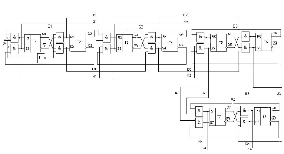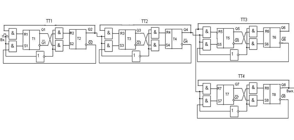 Рис. 4.2 Счётчик импульсов, состоящий из многовходных и многовыходных блоков (ячеек), подобных по составуТ-триггеру.