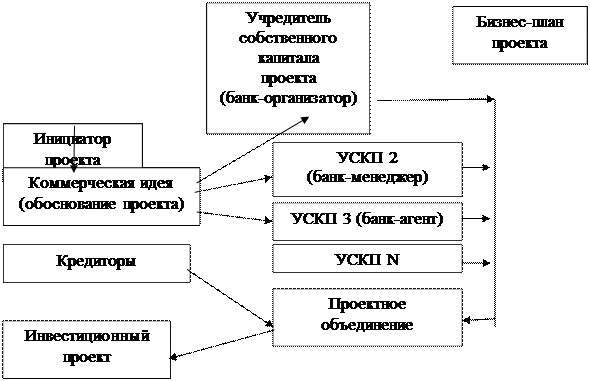 Рисунок 6 – Схема организации проектного объединения Как правило, реализуя масштабный инвестиционный проект, российское предприятие сталкивается с необходимостью закупок зарубежного оборудования, сырья и материалов. Это само по себе подразумевает заключение внешнеэкономических контрактов с зарубежными поставщиками, что, соответственно, влечёт возникновение дополнительных внешнеэкономических рисков в ходе реализации проекта. К сожалению, далеко не все предприятия имеют квалифицированный кадровый состав, что сказывается (на первых этапах) на качестве внешнеторговой документации, а затем и на качестве обеспечения законных интересов российских импортёров. Решить эту проблему можно при осуществлении схем проектного финансирования. Характерной особенностью проектного финансирования является создание проектного объединения, осуществляющего непосредственную реализацию проекта, то есть для реализации конкретного инвестиционного проекта создаётся Проектное объединение (ПО) – юридическое лицо, зарегистрированное в соответствии с действующим законодательством соответствующего территориального образования. ПО имеет самостоятельный баланс. Схема организации проектного объединения представлена на рис.6. Проектное объединение проводит тендеры для генеральных подрядчиков и субподрядчиков в рамках определённого проекта, а также осуществляет полный контроль за всеми этапами осуществления инвестиционного проекта. Собственный капитал проектного объединения (или собственный капитал проекта) образует основу структуры кредитования. Собственный капитал имеет особое значение до момента сдачи проекта в эксплуатацию, поскольку он представляет собой резерв для компенсации потерь и преодоления финансовых трудностей. Важнейший источник для внесения собственного капитала – сам инициатор (заявитель) проекта. Размер собственного капитала проекта в общем финансировании является для займодателей показателем их заинтересованности и одновременно служит важным критерием для предоставления кредитов. Инициатор (заявитель) проекта участвуют в капитале проекта только в размере своего собственного вклада. Обычно в качестве вкладчиков в собственный капитал проекта выступают также стороны, которые получают непосредственную выгоду от данного проекта, а именно: поставщики, закупщики, генеральные подрядчики и государственные организации. Участниками формирования собственного капитала ПО могут быть также коммерческие банки, страховые организации, инвестиционные фонды и так далее, то есть любой участник реализации инвестиционного проекта. Международные финансовые организации, как, например, Европейский банк реконструкции и развития, могут также являться потенциальными вкладчиками в собственный капитал проекта. Определяющие факторы для установления доли собственного капитала в общем финансировании проекта: риски проекта, прибыль на инвестированный капитал, то есть потоки денежных средств. Другими словами, чем выше риски, связанные с реализацией инвестиционного проекта, чем ниже чистая текущая стоимость, тем больше должна быть доля собственного капитала проекта. В зарубежной практике доля собственного капитала составляет от 30% до 50%. С точки зрения учредителей собственного капитала проекта его доля в общем фина