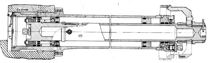 Цилиндр вставляется в левое отверстие казенника и закрепляется в нем, от проворота цилиндр стопорится винтом. Спереди к цилиндруприварена крышка,вкоторую ввинчивается клапан I. Сзади цилиндрзакрывается крышкой,в которой имеется два отверстия, закрытые сеткой. Стопорится крышкапроволокойс пломбой. Шток пустотелый. Наружная поверхность штока хромируется. На заднем конце штокаимеется внутренняя резьба, которой шток навинчивается на поршень, а также три отверстия Б, соединяющие полости В и Г. Поршень на наружной поверхности имеет две канавки, в которых устанавливаются резиновые кольца с фторопластовыми шайбами. На заднем торце поршня имеются два резьбовых гнезда и надписи ЖИДКОСТЬ, ВОЗДУХ.