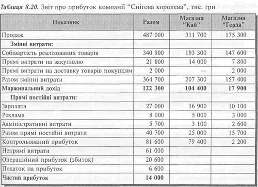 Діяльність керівника магазину "Герда" на підставі такого звіту може дістати негативну оцінку, оскільки має місце збиток у сумі 23 660 тис. грн. Але що засвідчує цей збиток? Чи є він наслідком хибної роботи менеджера? І чи дуже впливають на результат діяльності методи розподілу загальних витрат? Щоб мати відповіді на ці питання, застосуємо маржинальний підхід до складання звітів центрів прибутку. Припустімо, що прямі витрати на закупівлю товарів та доставку їх покупцям є змінними витратами, а решта операційних витрат — постійними. Це дасть нам змогу скласти звіт про прибуток, який послідовно відображає внесок підрозділів у покриття постійних прямих і непрямих витрат (табл. 8.20). Така форма звіту вможливлює оцінювання діяльності менеджера на підставі контрольованих ним показників. Виходячи з цього, бачимо, що керівник магазину "Герда" забезпечив внесок у покриття загальногосподарських витрат у сумі 2 200 тис. грн.