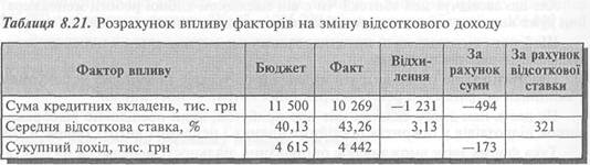 Вплив зміни суми виданих кредитів визначають за формулою: (СКф - СКб) х ПСф (8.30) де: СК — сума наданих кредитів, тис. грн СКб — сума наданих кредитів по бюджету, тис. грн ПСб — середня бюджетна відсоткова ставка, %. (10 269-11 500) • 40,13 = -494 тис. грн Вплив зміни відсоткової ставки визначають за формулою: (ПСФ - ПСб) х СКф (8.31) де: ПС, — середня фактична відсоткова ставка, % ПСб — середня бюджетна відсоткова ставка, % СК. — сума фактично наданих кредитів, тис. грн. (43,26 - 40,13) • 10 269 = 321 тис. грн Факторний аналіз також допомагає проводити дослідження впливу факторів на відсоткові видатки.