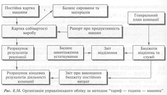 Вплив зміни суми залучених коштів обчислюють за формулою: (ЗКф - ЗКб) х ПСб (8.32) де: ЗКф — сума фактично залучених коштів, тис. грн ЗКб — сума залучених коштів по бюджету, тис. грн ПС, — середня бюджетна відсоткова ставка, %. (4 000 - 3 060) • 20,26 = 190,4 тис. грн. Вплив зміни відсоткової ставки визначають за формулою: (ПСф - ПСб) х ЗКф (8.33) де: ПС6 — середня фактична відсоткова ставка, % ПСб — середня бюджетна відсоткова ставка, % ЗК. — сума фактично залучених коштів, тис. грн. (51 - 20,26) • 4 000 = 1 229,6 тис. грн. При аналізі відхилень комісійних доходів і видатків основними факторами будуть: обіг за рахунками клієнтів та розмір тарифу на цей вид послуг. 8.5. ОРГАНІЗАЦІЯ ОБЛІКУ ВІДПОВІДАЛЬНОСТІ ЗА МЕТОДОМ "ТАРИФ - ГОДИНА - МАШИНА" Метод "тариф — година — машина" був розроблений американським фахівцем Спенсером А.Такером як розвиток концепції обліку за центрами відповідальності. Сутність цього методу полягає в тому, що за кожним центром відповідальності закріплюють машини і заздалегідь визначають витрати на одну машино-годину. Знаючи час роботи кожної машини і вартість машино-години, неважко встановити прямі витрати на обробку, до яких потім додають амортизацію. Фактичну собівартість окремих видів продукції розраховують як суму матеріальних витрат і добутку планової (або фактичної) собівартості машино-години на кількість годин, витрачених на кожному етапі технологічного процесу. Зрештою калькулювання остаточно зосереджується на певній ділянці технологічного процесу, а не на готовій продукції. Розглянемо організацію управлінського обліку з використанням методу "тариф — година — машина" на прикладі однієї з французьких компанії, яка виготовляє телефонний кабель. Організація управлінського обліку в компанії забезпечується за допомогою комплексу документів, котрий містить: генеральний план компанії; постійну картку машини; щомісячний звіт про роботу устаткування; картку собівартості виробу; баланс сировини та матеріалів; баланс завантаження устаткування; звіт відділення; виконання загального бюджету постійних витрат; розрахунок результатів реалізації продукції; розрахунок кінцевих результатів діяльності компанії. У загальному вигляді взаємозв'язок цих документів показано на рис. 8.38. Генеральний план містить основні відомості про діяльність компанії — величину її капіталу, курс акцій, заплановані результати і витрати за різними видами діяльності (виробничої, комерційної, фінансової тощо) у зіставленні з аналогічними показниками минулого року, а також низку інших відомостей, необхідних для економічних розрахунків, поточного контролю й аналізу. Показники генерального плану є вихідними для складання бюджетів витрат відділень та служб підприємства. Високий рівень автоматизації виробництва і управління в компанії уможливлює виділення як первісного центру витрат окрему машину (верстат). Для кожної машини ведеться постійна картка (табл. 8.23), в якій наводяться базові дані (кількість робітників, необхідна для обслуговування машини, погодинна оплата їхньої праці; потужність, що споживається; вартість одиниці електроенергії), а потім на цій основі розраховують нормативну вартість години роботи цієї машини.