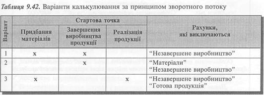 Упровадження системи "якраз вчасно" сприяє трансформації традиційних систем калькулювання (за замовленнями, за процесами) у калькулювання за принципом зворотного потоку. Калькулювання за принципом зворотного потоку (Backflush Costing) — це спрощена система калькулювання стандартних витрат, яка передбачає: / виключення чи об'єднання окремих рахунків запасів; / здійснення бухгалтерських записів і калькулювання собівартості тільки після певної події (у стартовій точці). Така система калькулювання фокусує увагу на результаті діяльності (випуск або реалізація продукції), а вже потім працює у зворотному напрямі для віднесення витрат до реалізованої продукції та запасів. Це означає, що калькулювання продукції відкладається до моменту завершення її виробництва або реалізації. Існують різні варіанти такого калькулювання (табл. 9.42).