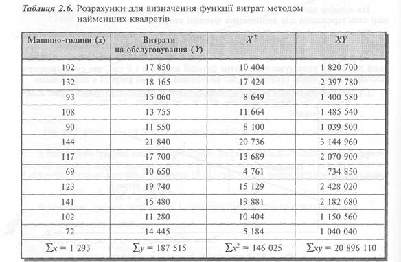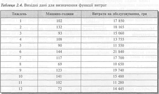 За результатами наведеного аналізу функцію витрат магазину "Час" можна описати так: Y= 116 000+ 129х. Отже, якщо в наступному періоді магазин планує збільшити обсяг продажу до 3 000 годинників*, а витрати на оренду будуть збільшені на 10 000, тоді загальні бюджетні витрати магазину становитимуть: (116 000 + 10 000) + (129 ■ 3 000) = 126 000 + 387 000 = 513 000 грн. Метод аналізу рахунків доволі широко використовують на практиці. Але слід зважати на те, що він значною мірою базується на досвіді та інтуїції менеджера й аналізі минулих подій. Через те його вадою є певна суб'єктивність і можливість суттєвих відмінностей між минулими та майбутніми умовами діяльності. Певною мірою уникнути зазначених вад можна за допомогою серії спостережень та застосування математичних методів. Для розгляду решти методів скористаймося вихідними даними, наведеними у табл. 2.4. Це результати спостережень взаємозв'язку між часом роботи устаткування та витратами на його утримання за минулі дванадцять тижнів.