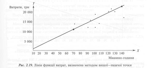 Метод візуального пристосування і Метод візуального пристосування (Visual-Fit \ Method) — графічний підхід до визначення функції \ витрат, за якого аналітик візуально проводить пряму лінію, беручи до уваги всі точки витрат. Припустімо, що в нашому випадку аналітик, намагаючись врахувати всі точки на графіку, провів лінію функції витрат таким чином (рис. 2.21):