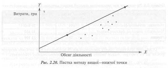 Графічне відображення функції витрат дає змогу уникнути ризику помилки, пов'язаного із застосуванням методу вищої—нижчої точки. Річ у тому, що при використанні цього методу ми проводимо лінію функції витрат через вищу і нижчу точку графіка, ігноруючи всі інші точки. Але якщо ці інші точки не мають тісного взаємозв'язку з вищою та нижчою точками (рис. 2.20), то функція витрат не відображатиме реальної залежності між витратами та їхнім фактором.