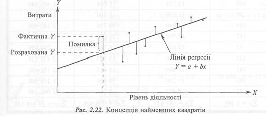 З наведеного графіка видно, що постійні витрати становлять 5 000 грн. Для розрахунку змінних витрат використаємо дані при обсязі діяльності 132 машино-годин. У цій точці загальні витрати становлять 18 165 грн. Отже, змінні витрати дорівнюють: 18 165 - 5 000 = 13 165 грн. Відповідно, змінні витрати на 1 машино-годину становитимуть: 13 165: 132 = 99,7 грн. Функція витрат у цьому разі буде: Y= 5 000 + 99,7х Метод візуального пристосування дає змогу уникнути вад методу вищої— нижчої точки, але не гюзбавляє суб'єктивності, оскільки результати розрахунків суттєво залежать від точності ока й несхибності руки аналітика. Регресійний аналіз Регресійний аналіз (Regression Analysis) — статистична модель, яку використовують для визначення зміни середнього значення залежної змінної величини під впливом зміни значення однієї або кількох незалежних змінних величин. При застосуванні регресійного аналізу для визначення функції витрат загальну суму витрат розглядають як змінну величину, залежну від певного чинника (обсягу виробництва, кількості замовлень тощо), який виступає як незалежна величина. Лінійний взаємозв'язок між залежною та незалежною змінними величинами можна описати графічно як лінію регресії, або за допомогою формули (рівняння регресії). Модель, яка використовує тільки одну незалежну змінну величину для визначення зміни незалежної змінної величини, називають простим регресійним аналізом. Вона має вигляд: Y = а + Ьх Модель, що використовує кілька незалежних змінних величин для визначення зміни залежної змінної величини, має назву множинний регресійний аналіз і може бути описана так: Y=a+blXl+b2x2+...+bnxn. (2.2) На відміну від методу вищої-нижчої точки, регресійний аналіз враховує всі дані спостереження для визначення функції витрат. Поряд із цим, регресійний аналіз уможливлює уникнення вад візуального підходу, оскільки передбачає застосування методу найменших квадратів. Метод найменших квадратів (Least—Square Method) — це статистичний метод, який дає змогу розрахувати елементи функції витрат а і Ь так, що сума квадратів відстані від усіх точок сукупності, що вивчається, до лінії регресії є найменшою. Сутність цього методу можна проілюструвати за допомогою графіка (рис. 2.22).