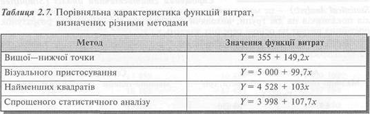 Величину постійних витрат (а) визначають за формулою: а = (УД - YJa) I (Xt - Хо), (2.8) де YQ і Yl — середні значення витрат; Хо і Хх — середні значення обсягу діяльності. Підставивши у наведену формулу розраховані середні значення Х\ Y, одержимо: а = ((13 473 • 128) - (17 780 ■ 88)): (128 - 88) = 159 904: 40 = 3 998 грн. Знаючи величину постійних витрат, можемо обчислити змінні витрати на одиницю (Ь): b = (13 473 - 3 998): 88 = 107,7; або Ь = (17 780 - 3 998): 128 = 107,7 Виходячи з цього, функція витрат, визначена за допомогою спрощеного статистичного аналізу, є: Y= 3 998 + 107, їх. Вибір серед функцій витрат Застосування різних методів для визначення функції витрат дає різні результати (див. табл. 2.7).